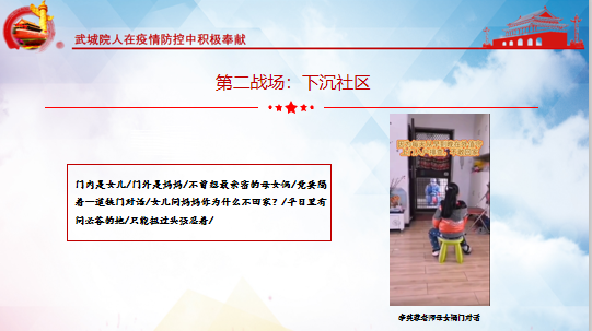 李老师给大家讲了武城院师生在改造“隔离点”、下沉社区等两个战场中所做出的积极奉献故事。其中,李芙蓉老师与女儿隔窗对话、熊雯老师第一时间鲜血、贺千禧同学捐献“免疫血浆”等等故事让现场的所有同学特别动容。