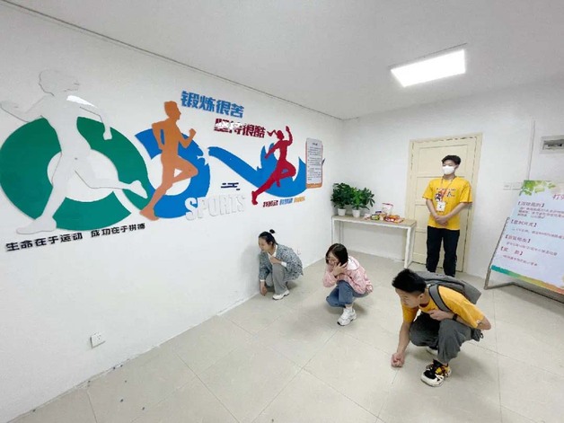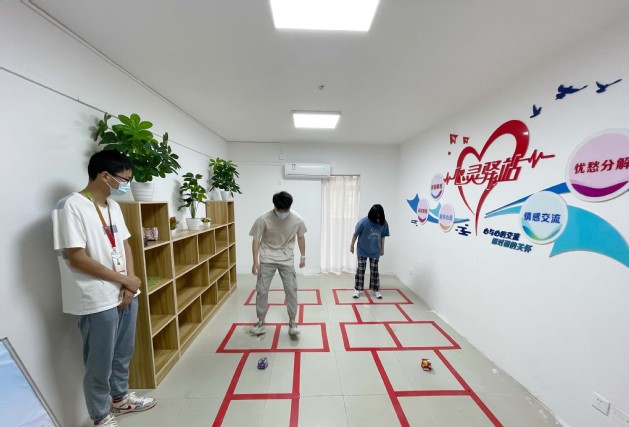 然后走进“心语心晴”活动室,童年的回忆扑面而来,一格一格的“红格子”组成了童年最熟悉的“跳房子”,在“房子”里不亦乐乎跳跃的我们仿佛还是童年里曾经那个无忧无虑的少年!双人式比拼完成后,速度更快的同学赢得了一份童年零食小奖品,同学们在欢乐游戏的同时物质上和精神上都满载而归。