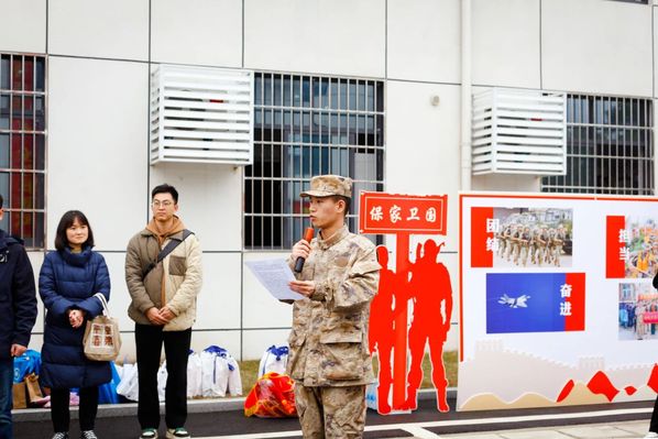 随后,黄书记为我院应征入伍的10名学生披挂绶带,佩戴红花,并赠送学院精心准备的纪念品。黄书记欣慰地表示,同学们在役前训练中迅速成长,令人振奋。这些积极应征入伍的同学,不仅是国家的栋梁,也是学院的骄傲,他代表学校向他们送上最真挚的祝福。黄书记也对入伍的同学们提出要求,希望入伍的学子能够不忘初心,珍惜荣誉,坚定报国之志,锻炼品格,争当精兵。
