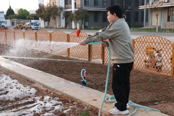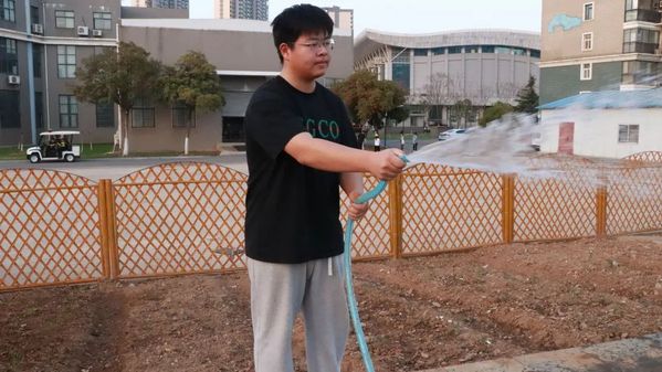 揭开保温膜后,同学们便拿起水管为每一株幼苗们悉心浇水。踩着湿润的土地,感受新生的气息,尽管鞋子和衣摆都已沾染泥土,却抵不过嫩芽出土的那份喜悦。
