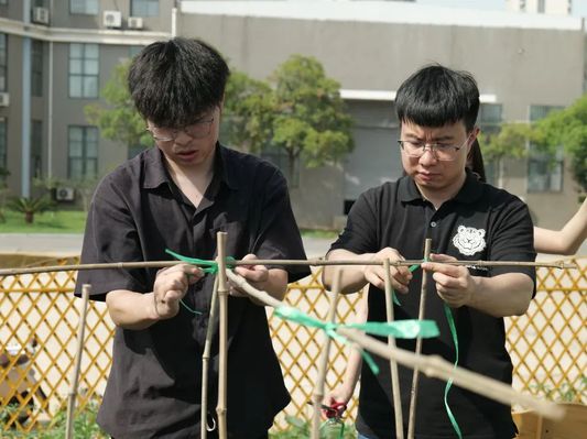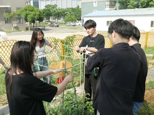 紧接着,同学们分工合作,搭起整齐的支架。大家小心翼翼地将蔬菜苗植入泥土中,浇上适量的水。新种下的蔬菜苗在微风中轻轻摇曳,仿佛在向师生们致谢,也预示着未来的丰收。