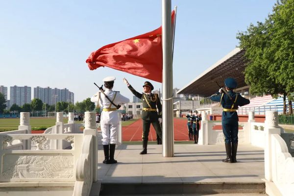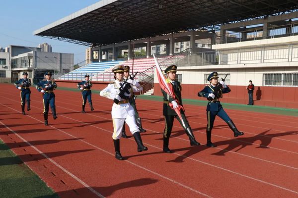 升旗仪式开始,国旗护卫队如青松挺立,步伐坚定有力,他们护送着五星红旗走向升旗台。国歌奏响,红旗腾空而起,全场师生肃穆行礼,眼神中满是对祖国的敬意与热爱。