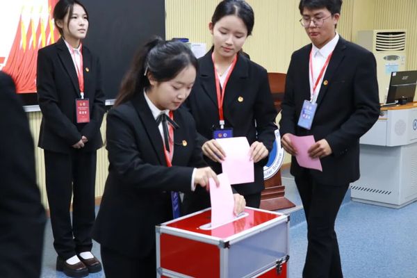 投票环节在庄严的氛围中有序进行。各位代表们认真审阅选票,慎重斟酌,将这份选票郑重投入票箱,依法依规选举出新一届学生会委员会委员。